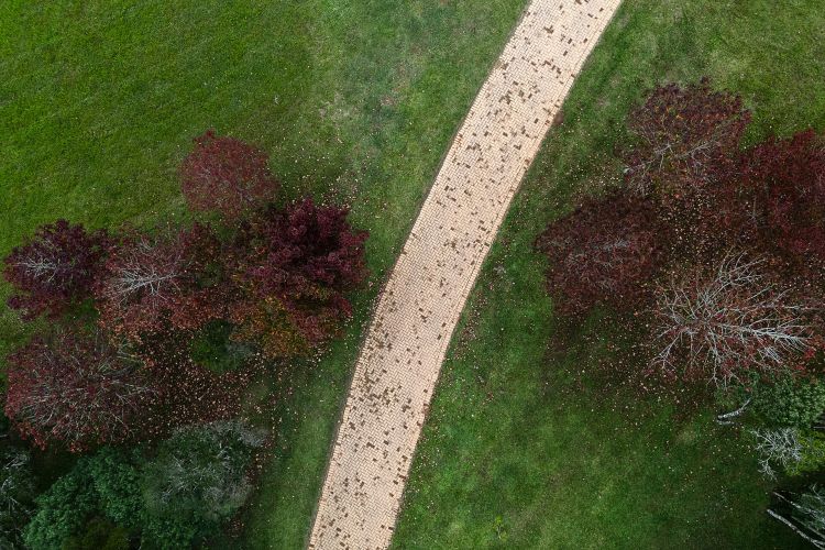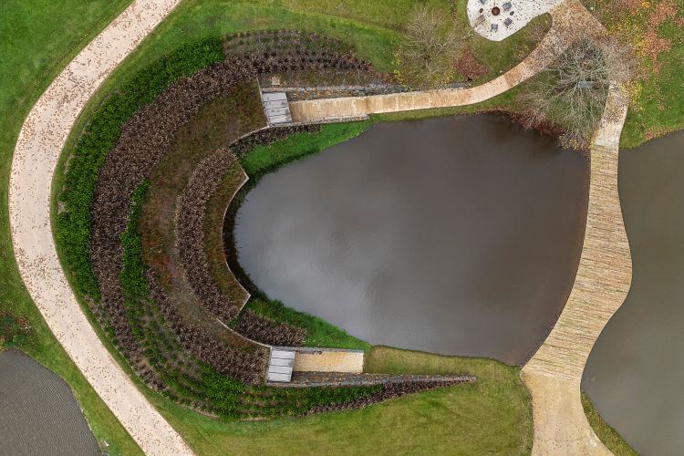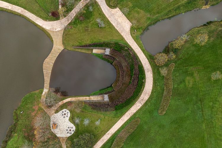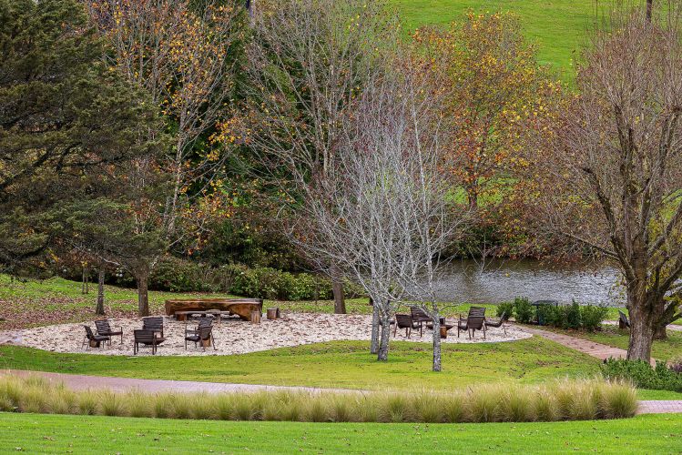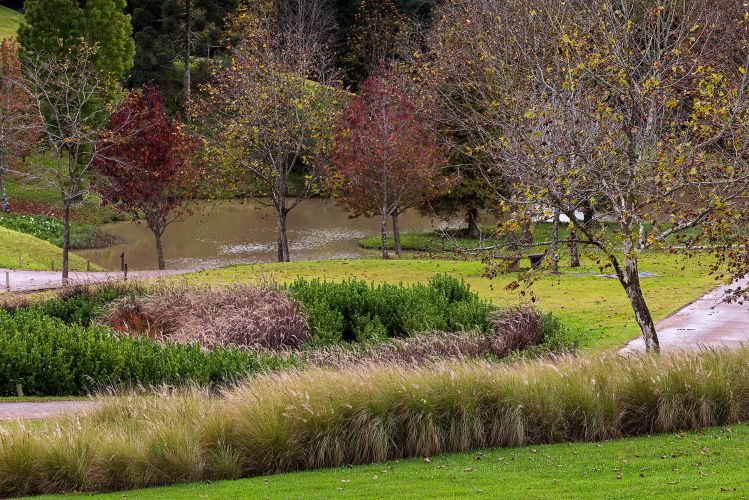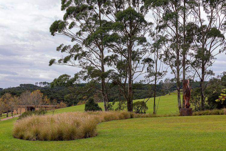 Desde então, temos trabalhado no incremento da arborização iniciada pelos proprietários, além de incluir canteiros, caminhos, e áreas de estar para convívio, contemplação e lazer. Nossas escolhas priorizaram materiais naturais, alinhados visualmente com as cores e as linhas da paisagem existente. Desenhamos grandes canteiros que acentuam as curvas da topografia natural, integrando o espaço construído ao ambiente.