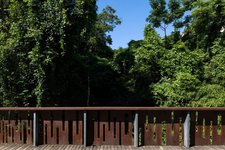 Equipamentos para lazer foram incluídos usos nas áreas mais abertas, preservando o espaço já ocupado pela natureza. Os materiais escolhidos são naturais e mantém o solo permeável. Toda a área que estava degradada recebeu plantio de árvores nativas.