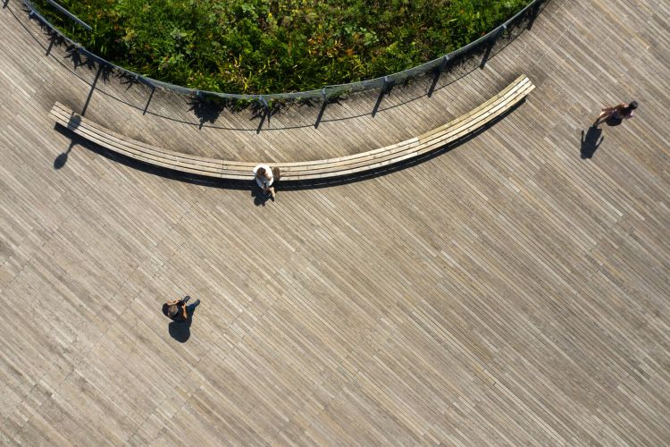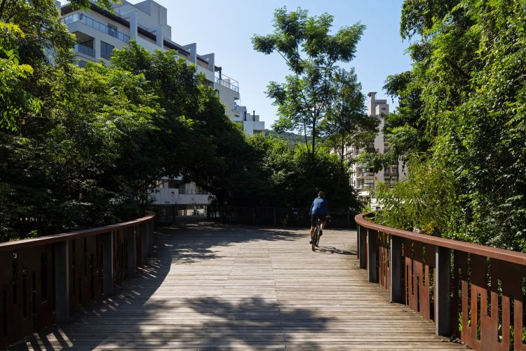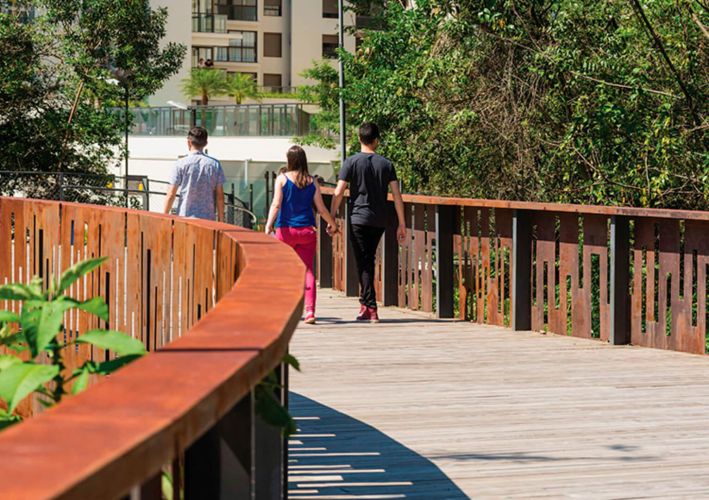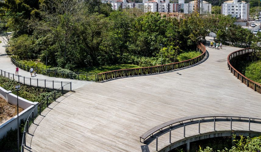 Conectividade: integrando localmente as áreas por elementos funcionais: caminhos para pedestres e ciclistas, a ponte e decks que conectam o parque a empreendimentos privados. A conexão visual e física entre os edifícios e as áreas públicas foi trabalhada para dinamizar o espaço público.