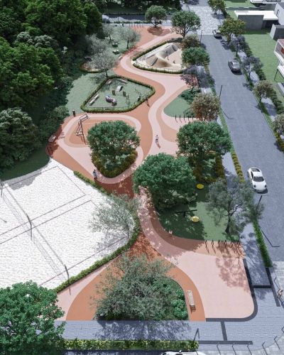 Acreditamos que cada vez que é criado um pedaço de cidade, como no caso de um loteamento, existe uma oportunidade de produzir um espaço urbano de qualidade. Neste loteamento de 53 lotes, fomos responsáveis pelo Street Scape e pelo projeto da Praça pública de lazer. Organizamos os perfis viários criando ruas acalmadas e amigáveis para os pedestres, incluindo arborização, mobiliário, pavimento adequado, bem como definimos cruzamentos facilitados, trajeto para ciclistas, etc