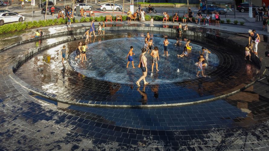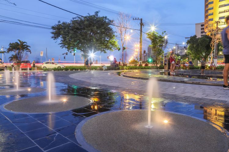 Ao entardecer, o colorido do pôr do sol reflete na lâmina d’água, revelando a iluminação sutil feita com fibra óptica que brota entre as peças de pedra basalto que cobre o chão. Tal gesto faz alusão a um céu repleto de estrelas bem no coração da praça e também no caminho que leva até ele, criando uma atmosfera lúdica. Próximo ao perímetro da praça, postes de luz mais altos completam o esquema de iluminação e intensificam a sensação de segurança e conforto deste espaço público. Numa das esquinas, visitantes podem se inteirar da história do local em vários totens que informam sobre seu rico passado.
