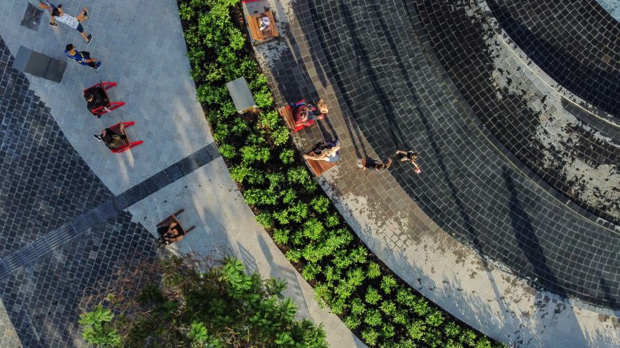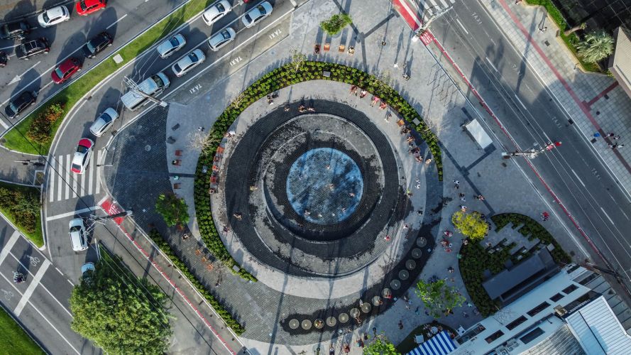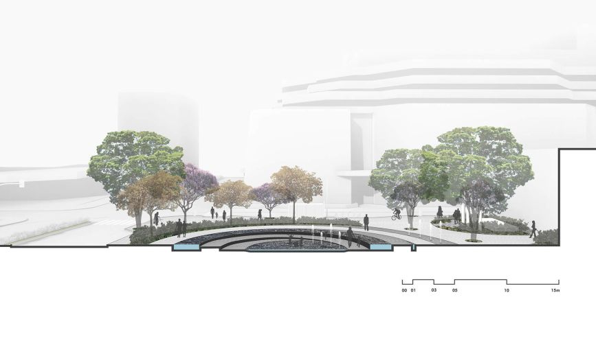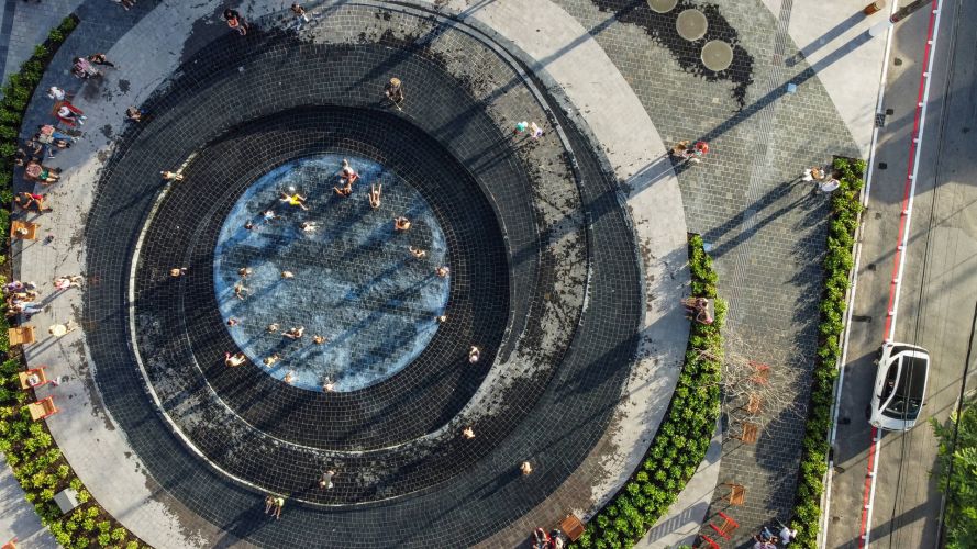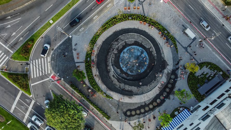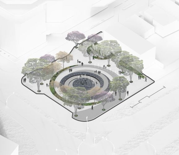 Como elemento central, um caminho escultural reforçado pela paginação do piso conduz o visitante pela praça, onde se destaca a água. Sua forma circular, espiralando em direção ao centro em uma suave inclinação, remete à ilha cercada pela água e, com ainda mais água no centro, seu coração. De maneira intencional, o percurso faz cavar o solo para trazer a memória do passado ali guardada.